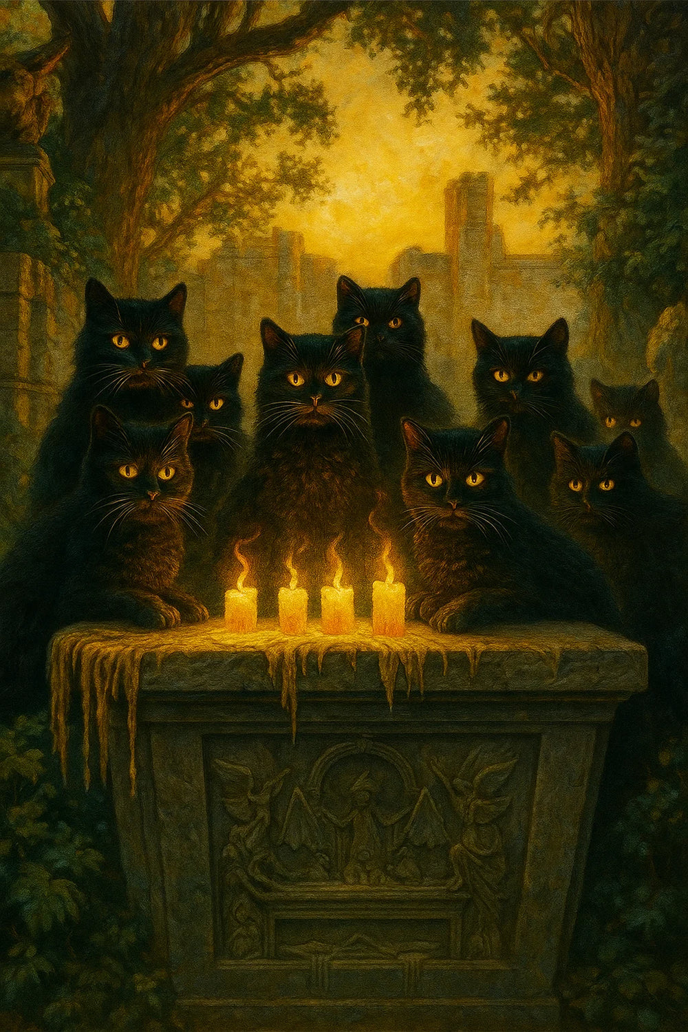 This mysterious painting depicts a circle of black cats gathered around a stone altar, their glowing eyes illuminated by the flicker of candlelight. The scene blends gothic elegance with enchanting detail, creating a perfect balance of eerie and captivating. Ideal for Halloween or as a year-round statement piece, it adds a touch of mystical charm to any space.