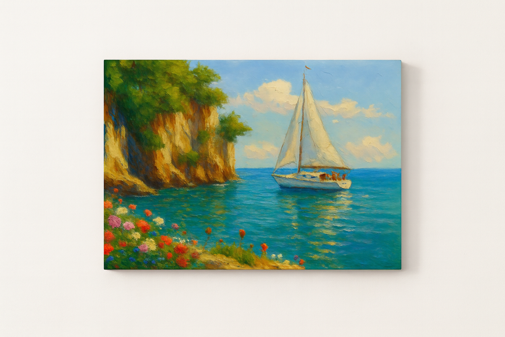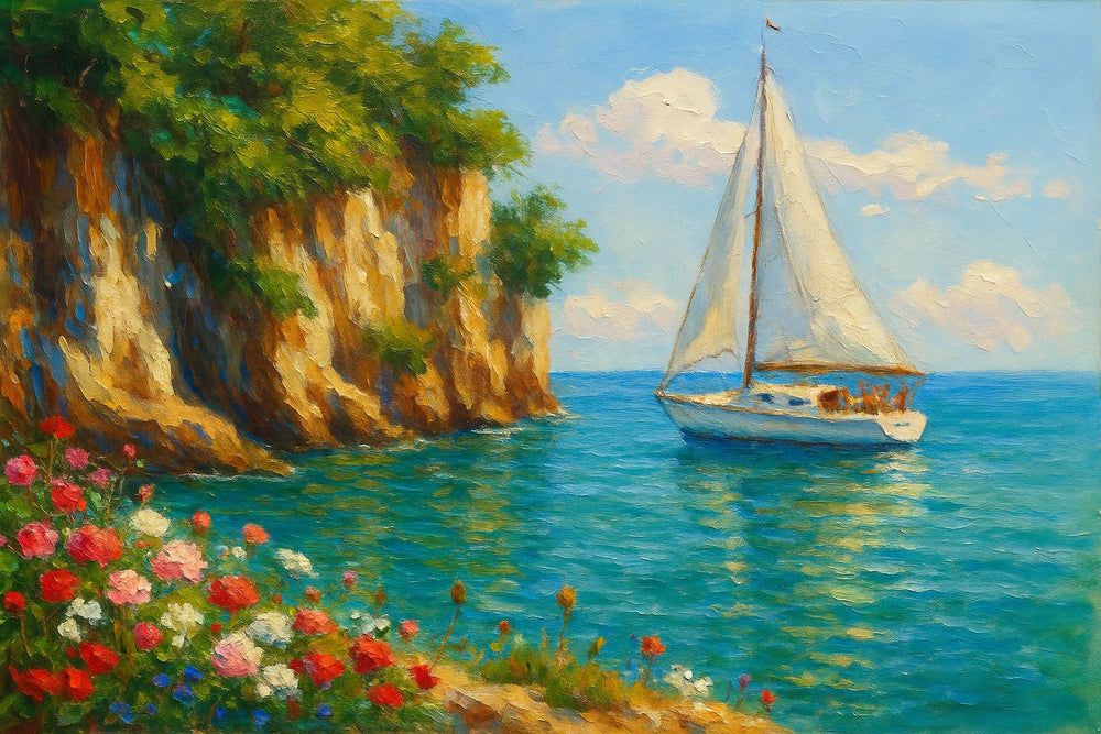 A sailboat drifts gracefully across calm waters, framed by blossoms and the glow of the horizon. This artwork brings a sense of peace and timeless beauty, evoking the charm of quiet ocean moments. Perfect for brightening your space or gifting to someone who treasures the sea’s serenity.