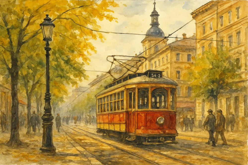 Step back in time with this charming autumn street scene, where a vintage red tram rolls through golden tree-lined avenues. Soft watercolor tones and gentle light create a nostalgic and peaceful atmosphere. A timeless artwork that captures the romance of city life, it’s the perfect piece for painting and bringing classic charm into your space.