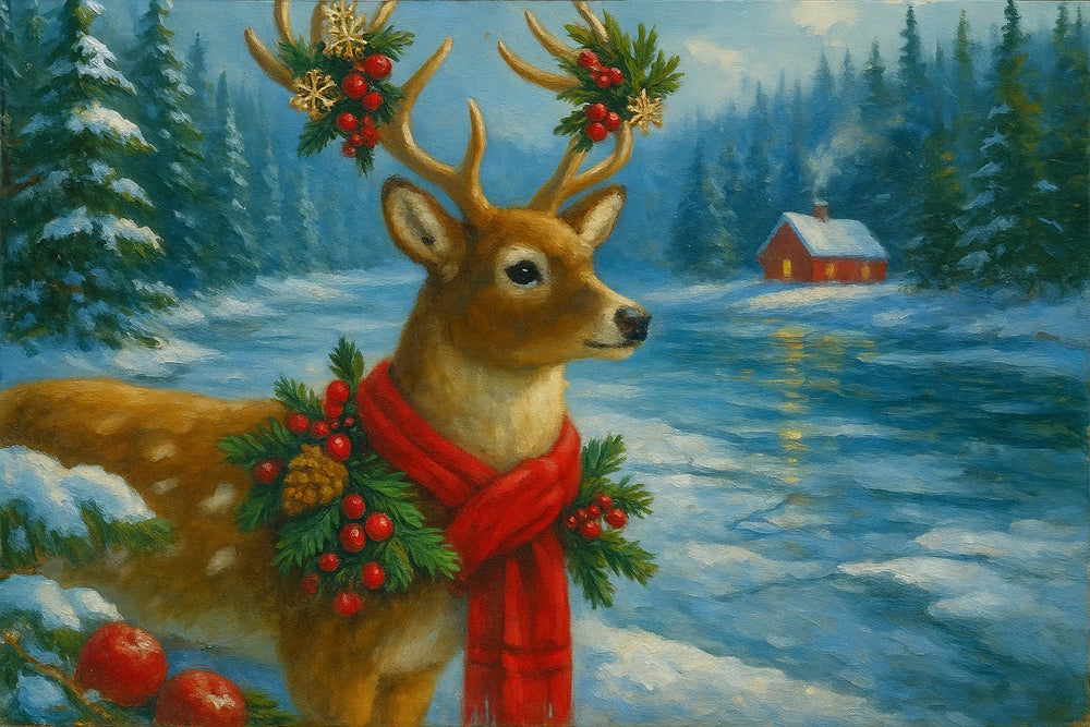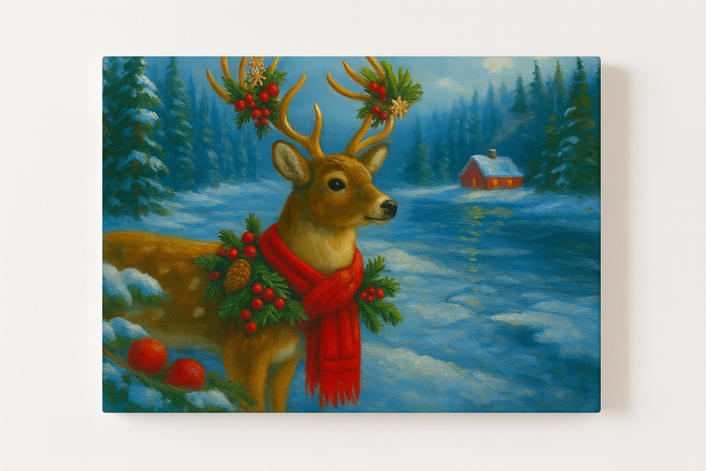 This enchanting Christmas painting captures the peaceful magic of winter — a calm deer adorned with festive greenery standing beside a glistening frozen lake and a warmly lit cabin in the distance. Its serene colors and soft glow create a comforting holiday atmosphere that instantly warms any room. A beautiful choice for your Christmas painting collection, it’s the perfect piece to bring seasonal charm and quiet wonder into your home.