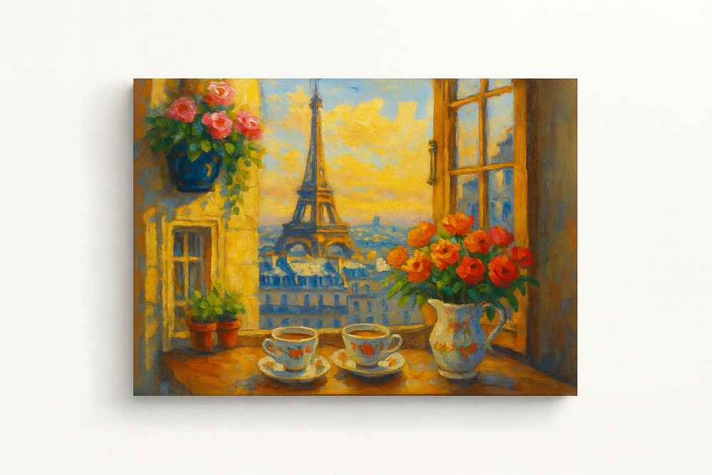 Wake up to the charm of Paris with this serene painting, where the Eiffel Tower glows under a golden sky. Bright flowers and a quiet coffee setting at the window create a warm, inviting atmosphere. Perfect for adding a touch of romance and elegance to any space, it’s a piece that makes every day feel like a Parisian morning.