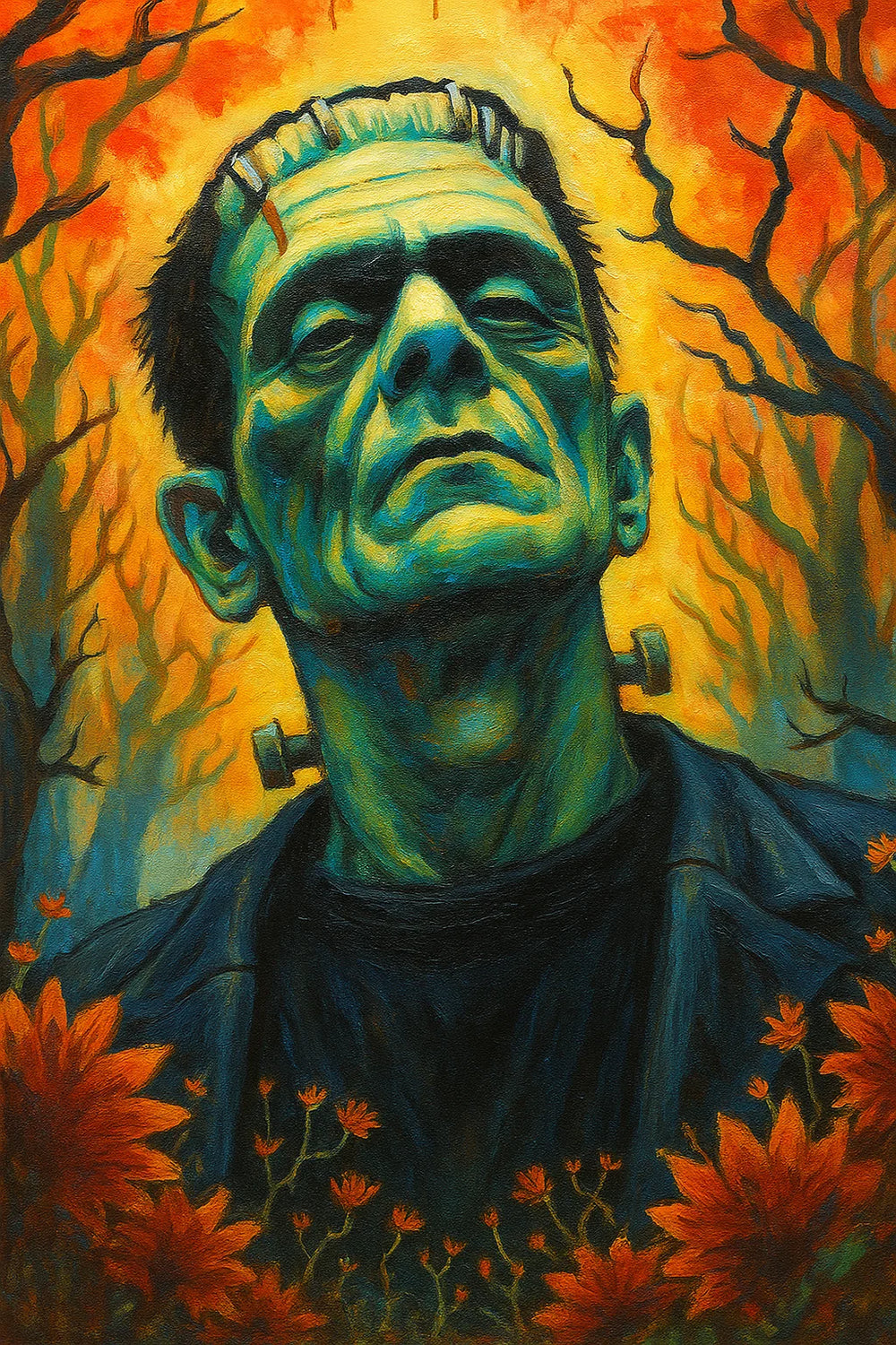This striking painting portrays the iconic monster with vivid detail, set against a dramatic backdrop that highlights his haunting expression and powerful presence. Bold colors and textured brushwork bring the character to life, blending eerie intensity with artistic depth. A perfect piece for Halloween or for anyone who appreciates timeless gothic artistry.
