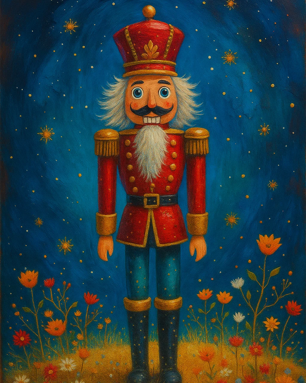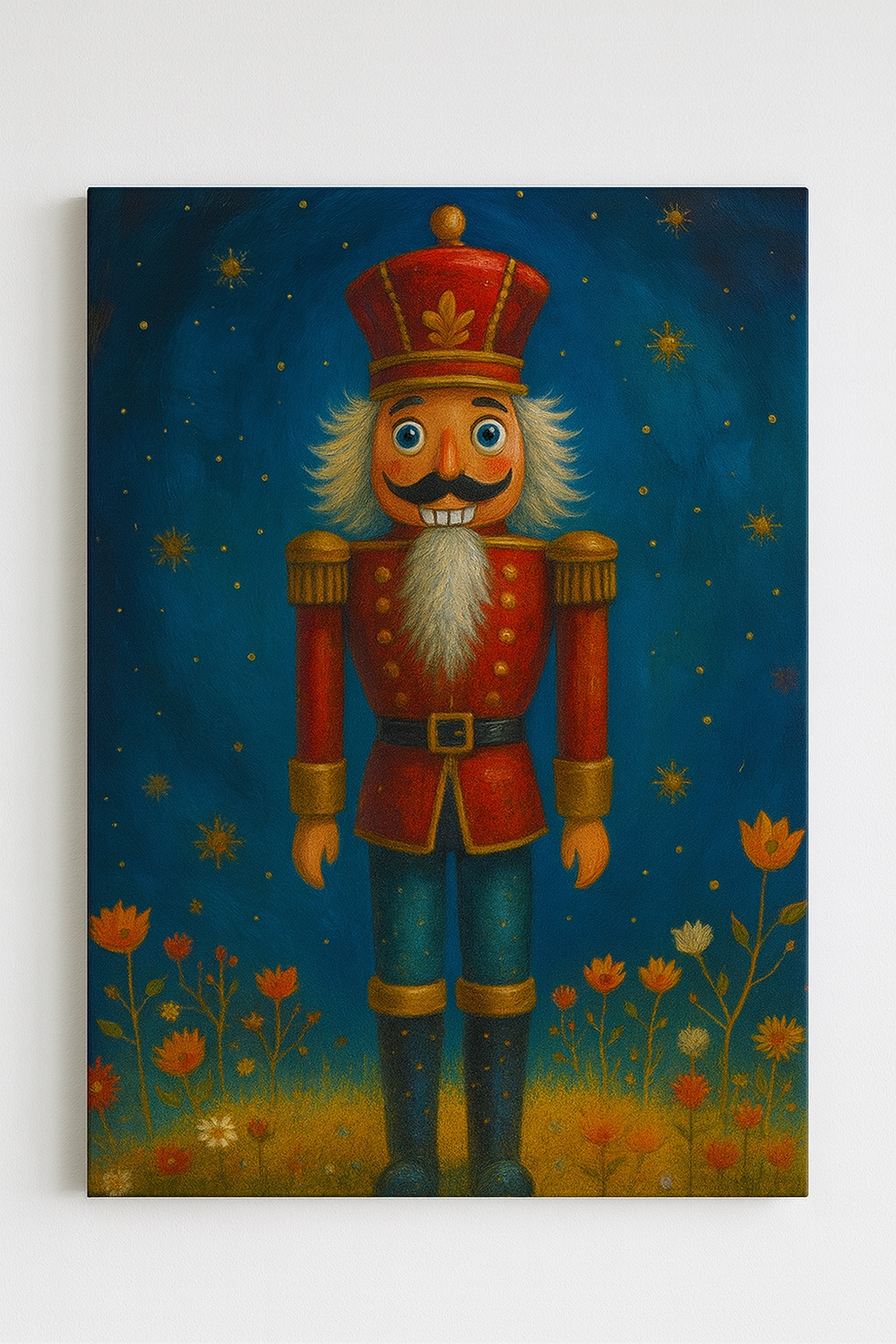 This charming Christmas artwork brings the magic of the season to life with a whimsical nutcracker standing proudly beneath a sky full of twinkling stars. Warm colors and delicate details create a nostalgic, festive atmosphere perfect for holiday decorating or gifting. A wonderful choice for a Christmas painting project, it adds joy, character, and timeless holiday cheer to any space.