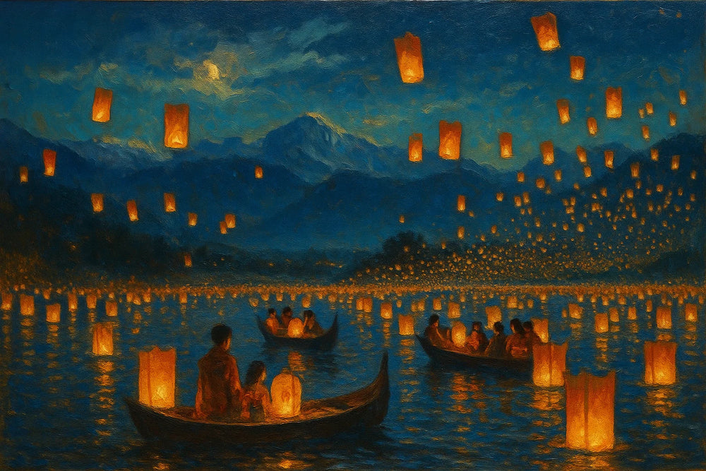 A breathtaking scene of glowing lanterns drifting into the sky and across the river, set against the serene backdrop of Vietnam’s mountains. The warm golden light reflects beautifully on the water, creating an atmosphere of peace, hope, and timeless tradition.