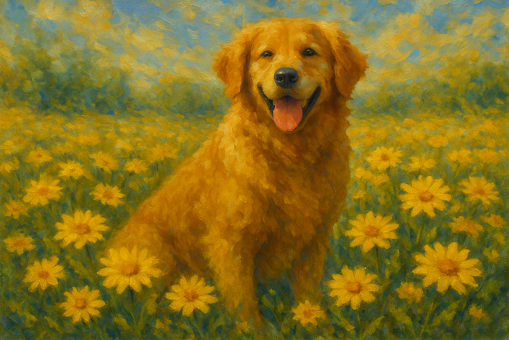 Invite the warmth of the countryside into your home with this soft impressionist-style print featuring a Golden Retriever nestled in a field of cheerful white and yellow daisies. Gentle brushstrokes blend the dog’s golden fur with the lush greens and sunlit blooms, creating a serene, heartwarming scene. Perfect for dog lovers and nature enthusiasts alike, this artwork captures a fleeting moment of joy and tranquility—ideal for framing or gifting.