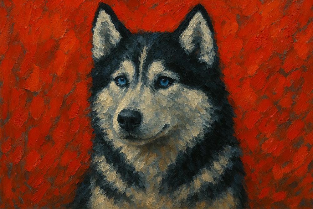 This striking portrait captures the noble beauty of a Siberian Husky against a vivid red backdrop, creating a bold yet elegant statement. The textured brushstrokes highlight both strength and warmth, making it a captivating centerpiece for any space. A perfect piece for dog lovers or anyone seeking artwork that adds depth, energy, and conversation to their home.