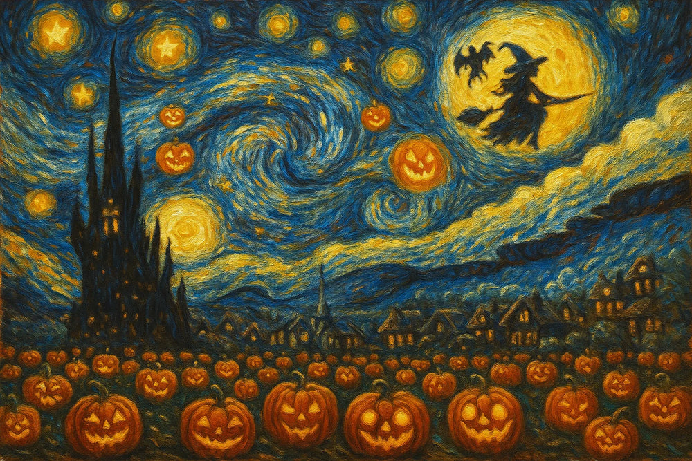 Celebrate the season with Halloween Night in Van Gogh Style. Inspired by the swirling skies of Van Gogh’s masterpiece, this artwork transforms Halloween into a vibrant scene of glowing pumpkins, a witch in flight, and a starry night alive with color. Bold brushstrokes and rich tones make it a joy to paint, and the perfect piece to capture the magic of Halloween in a timeless style.