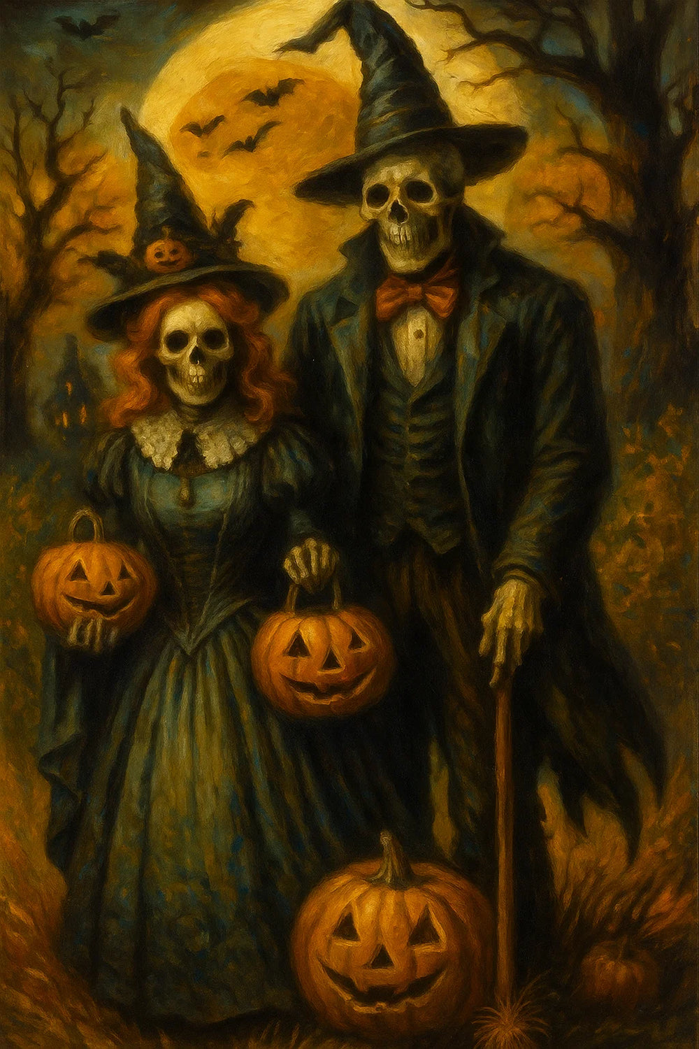 This hauntingly beautiful painting captures a skeletal couple dressed in vintage attire, standing beneath a glowing full moon on a Halloween night. With jack-o’-lanterns in hand, eerie bats overhead, and autumn trees framing the scene, the artwork blends gothic charm with festive spirit. Perfect for Halloween décor or as a striking year-round statement piece, it brings an unforgettable touch of dark elegance to any space.