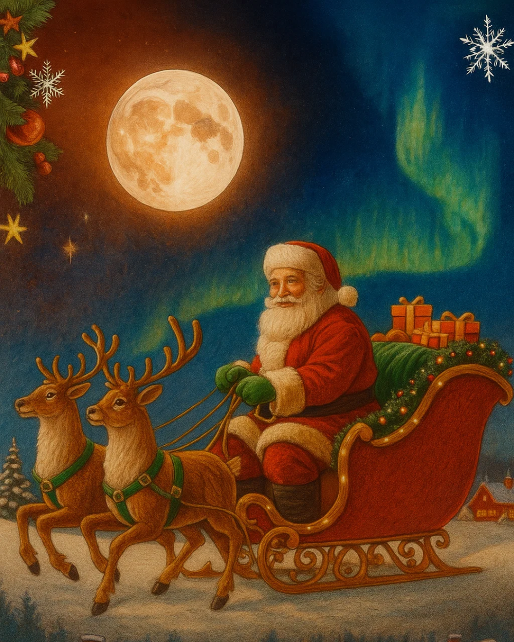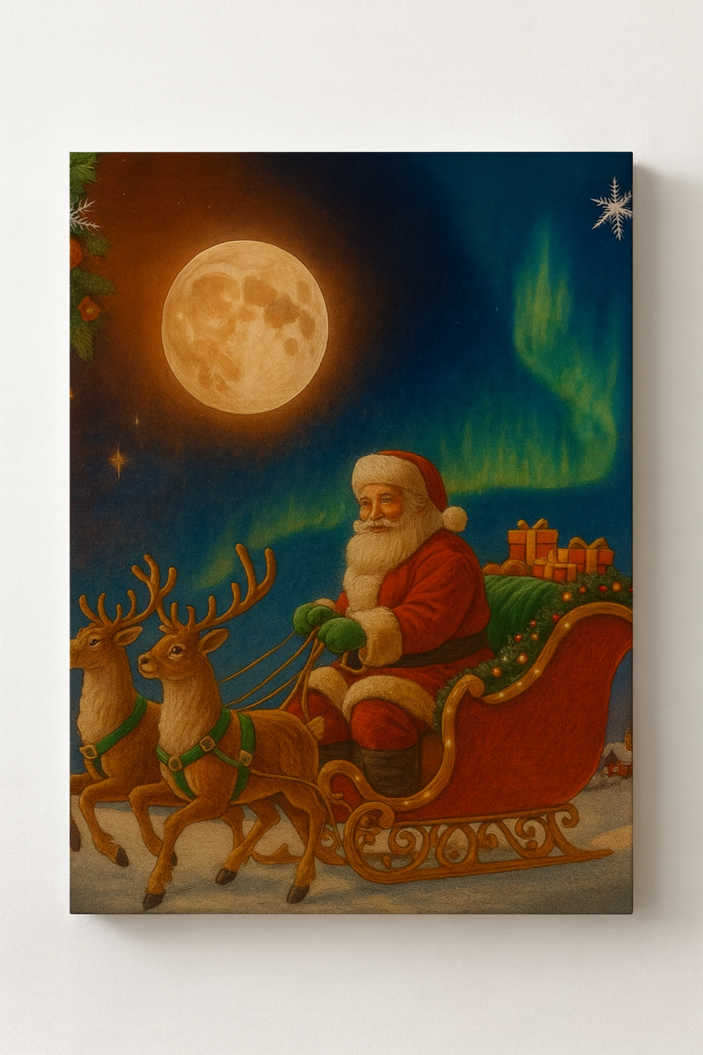 This enchanting painting captures Santa gliding through a magical winter night, guided by glowing reindeer under a radiant full moon and shimmering aurora. The warm tones of the sleigh and festive details bring a sense of nostalgia and joy to any holiday setting. A beautiful Christmas painting that adds the perfect touch of wonder and warmth to your seasonal décor.
