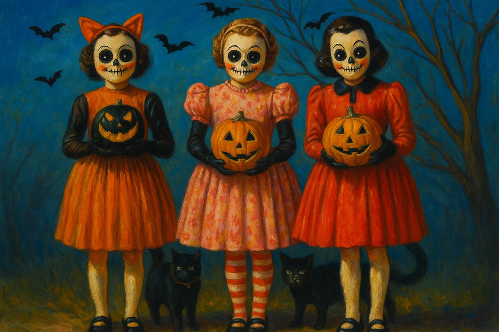 Step back in time with Retro Pumpkin Sisters. This whimsical artwork captures three girls in vintage Halloween style, holding glowing pumpkins under a moonlit sky with black cats and bats around them. The nostalgic charm mixed with spooky details makes it an absolute delight to paint. A perfect piece for anyone who loves retro Halloween magic and wants a festive masterpiece for the season.