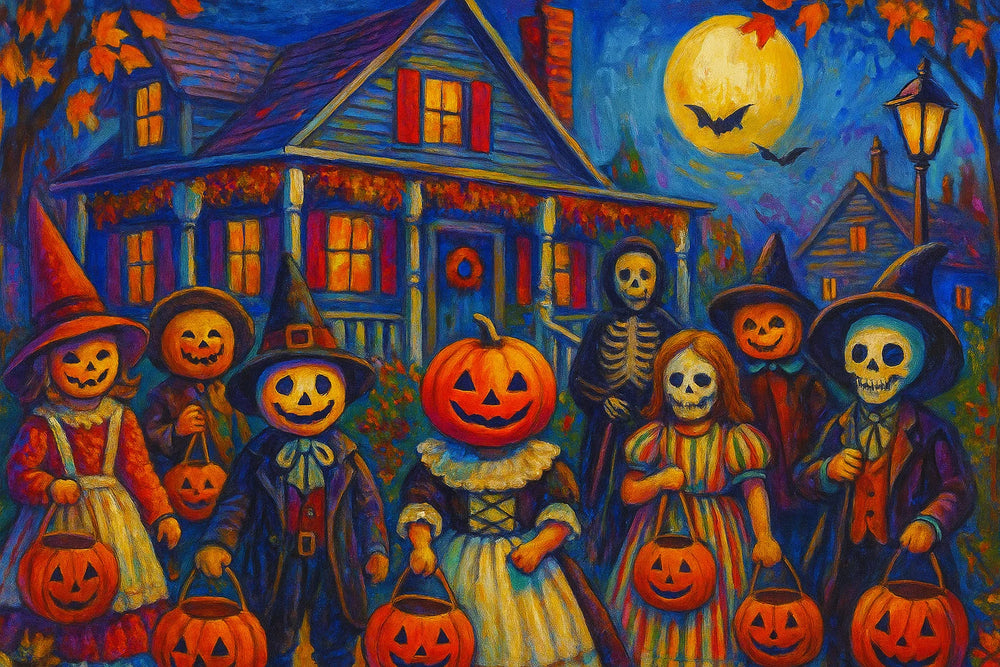 Step into the spirit of Halloween with Victorian House Halloween Party. This lively artwork shows children in costumes gathering at a glowing Victorian home, surrounded by autumn leaves and a full moonlit sky. Warm lights and festive details bring the scene to life, making it a delightful piece to paint. A perfect choice for anyone who wants to capture the joy and nostalgia of Halloween night.